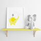 O adorável impressão de viveiros apresenta uma doce ilustração vetorial de um elefante amarelo segurando uma cinza e um guarda-chuva amarelo.