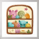 Ilustração adorável de brinquedos monstros numa prateleira. Perfeito com a decoração do seu filho e do berçário. Ilustrada e projetada por Patricia Alvarez.