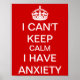 Inspirados por um antigo slogan de poster britânico da Segunda Guerra Mundial, os designs "Manter Calmo" são muito modernos e populares. Este poster vermelho desmascara a frase original "Mantenha calma e continue" e diz "Não consigo manter calma tenho ansiedade". Esta é uma tomada engraçada, hilária e humorística do ditado original e inclui o gráfico da coroa branca em cima.