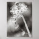 Uma fotografia a preto e branco de uma planta Dandelion. A flor se foi e agora a brisa está enviando as sementes para o crescimento futuro.