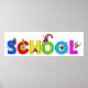 Ótima ilustração cartoon de meninos e meninas escalando em letras gigantes do alfabeto que soletra a palavra ESCOLA. Imagem disponível em vários presentes e produtos. Posters. Impressões.