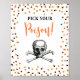 O sinal PICK YOUR POISON apresenta um design de confete cor de laranja, preto e dourado assustador para a sua festa temática de Halloween.