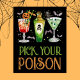 Este poster do Pick Your Poison Halloween apresenta coquetéis loucos ilustrados à mão com uma garrafa venenosa cercada por morcegos e estrelas numa paleta colorida de verdes e laranja. Você pode modificar o texto. Veja toda a coleção correspondente. Toda a trabalho de arte é ilustrada à mão e protegida por direitos autorais a Kaitlyn Thomas.