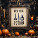 Avise aos hóspedes para onde vão buscar a bebida com o nosso sinal de festa de Pick Your Potion Halloween. O bonitinho poster do Halloween apresenta garrafas negras de aquarela com poções como wolfsbane e o olho do newt e as palavras "Escolha sua poção" contra um fundo de papel vintage. Use a poster para a estação de bebidas do seu Halloween ou simplesmente armar e usar como decoração domiciliar.