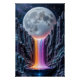 Um trabalho de arte de alto alivio de cerâmica visionário retratando uma paisagem de alienígena etérea. Uma lua colossal com esmaltes opalescentes, pearlescentes e sutis crackle domina um índio profundo e o céu roxo flertado com detalhes cristalinos como estrelas. Por baixo da lua corre uma radiante queda d'água de esmaltes moldados do arco-íris — pinks, amarelos, cianos e roxas — em cascata entre penhascos, cristalinos e jagados, vidrados em grandes chalés, blues e ametista. O fluxo luminoso se coleta em uma bacia escura-obsidiana refletiva, espelhando tanto a luz celeste quanto as cores vívidas. A peça combina geologia fantástica e elegância futurista, mostrando controle de vidros e detalhes esculturais que evocam mistério, serenidade e admiração.