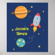 Para o espaço exterior e além! Decorar e transformar o quarto de um garotinho em uma aventura espacial com este poster colorido que vem com um belo foguete que sobe da Terra para o espaço sideral para se aventurar a outros planetas, estrelas e o desconhecido sobre um fundo azul-escuro do céu. Personalize com o nome da criança. Ele será o garoto espacial mais legal!