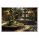 Espaguete russo revestido com rabo de brócolis sautês e azeite, servido no pátio romântico de uma vila italiana medieval com muros de mariposa e uma fonte levemente iluminada.