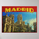 Esta maravilhosa cena de olhares de vintage apresenta prédios em Madrid, Espanha com o nome da cidade no topo em amarelo em fundo vermelho.