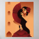 Menina espanhola de vestido preto, posando com fã sobre o fundo da cidade, cabelo embelezado com rosa