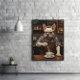 Esta peça de arte brincalhona captura um Bulldog Francês como uma barista de quadril, vestindo um flanela verde e branca e especificações de na moda. Atrás de um bar de café rústico, ele está a fazer arte em café como um profissional experiente. Um coágulo de leite em uma pata, um copo de café expresso na outra, ele é um negócio — com um zumbido. O quadro atrás lista especiais como "Pup-uccino" e "Latido Roast". Uma adição confortável e comédica a cozinhas, cafés, dormitórios ou cantos de café de escritório.