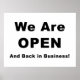 Um poster branco simples, mas ousado, que é adequado para fins comerciais que afirma: "ESTAMOS ABERTOS e de volta aos negócios" para ser exibido para uma empresa, organização ou grupo que tenha sido temporariamente fechado. Uma maneira excelente de avisar a todos que você está aberto e de volta aos negócios. Exibi-lo na janela da loja é uma opção.