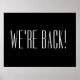 Um poster branco simples, mas ousado, que diz, "ESTAMOS DE VOLTA" para ser exibido para uma empresa, organização ou grupo que foi temporariamente fechado. Um poster excelente que pode ser colocado em uma janela de loja para que todos saibam que você está de volta aos negócios.