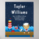 Um adorável macaco-marinheiro náutico sentado num pavimento de madeira com uma gaivota e um caranguejo. Ao fundo há um farol vermelho e branco, um pássaro giro em um veleiro, ondas oceânicas e um céu azul marinho estrelado à noite. Gráficos por PixelPaperPrints e DigitalCurio