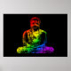 Um gráfico estilizado de uma estátua buda em cores arco-íris.