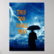 "Isso também passará" é um pensamento poderoso que dá poder e transporta um momento doloroso no tempo em algo esperançoso e dinâmico. Dá conforto, esperança e encorajamento. Texto: "Isto também passará" / Design: Homem de silhueta com guarda-chuva diante de uma situação escura e tempestuosa.