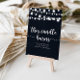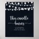 Este sinal de luzes de corda rústica com velas queimando é perfeito para um casamento simples. O design apresenta belas luzes de corda pintadas à mão em um fundo azul escuro.