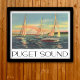 Barcos à vela no Puget Sound linda imagem de vintage com o Monte Rainier ao fundo no estado de Washington. A imagem é renderizada no estilo poster de viagens vintage com as cores suaves e a fonte de deco de arte para o nome abaixo.