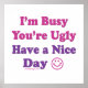 Estou ocupado. Você tem um bom dia. Engraçado e sarcástico dizer / citar texto / fonte em roxo e rosa.