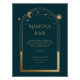O Bar Celestial Verde Mimosa Sol Lua Dourada Stars Astronomy Cósmic Cósmic Galaxy Event Poster apresenta um sol dourado, lua e estrelas em um fundo verde de floresta. Dentro é o seu texto personalizado. Projetado por ©2024 Evco Studio www.zazzle.com/store/evcostudio
