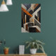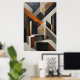 Arte abstrata geométrica com formas que lembram escadas e blocos arquitetônicos. Tons de preto, branco e laranja enferrujado. Textura pintada sofisticada. Ideal para decoração moderna e escritórios. Desenho estrutural que brinca com perspectiva e profundidade em uma composição elegante e contemporânea.