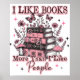 Design vibrante e colorido com uma pilha de livros com flores, borboletas e cogumelos. O texto colorido diz: "Eu gosto mais de livros do que de pessoas". Esse design está disponível em uma grande variedade de produtos.