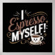 Esta é uma design gráfica divertida e inteligente, provavelmente criada para amantes do café. A design apresenta a frase punny "Eu me espresso!" O texto é colocado em negrito, com um estilo ocular, com uma textura marrom brilhante para a palavra "Espresso". As letras são uma mistura de fontes elegantes e cursivas e limpas, de blocos. Uma pequena xícara de café em estilo cartoon com rosto feliz é colocada no fundo, cercada por grãos de café e pequenos corações, acrescentando um elemento bonito e charmoso ao design. O fundo preto faz as cores marrom-quente, branca e dourada se destacarem. Este seria um design perfeito para uma caneca, t-shirt ou poster.