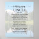 "Eu sinto sua falta" poema: "Pensei em você com amor hoje, mas isso não é nada de novo. Pensei em você ontem e nos dias anteriores também. Eu penso em você em silêncio. Muitas vezes falo seu nome. Tudo o que tenho são memórias e sua foto em uma moldura. Sua memória é meu tesouro com o qual nunca vou me separar. Deus tem você em sua guarda, eu tenho você no meu coração." Perfeito para lembrar um tio amado.