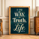 Uma arte de tipografia de estilo vintage com o verso "Eu sou o caminho, a verdade e a vida". O texto é escrito em uma fonte serif clássica e em negrito para "I Am" e uma fonte de script elegante para o resto da citação. O fundo tem um aspecto texturizado e curado que se assemelha a páginas manuscritas antigas, com uma paleta colorida de azuis profundos, dourados e cremes leves.