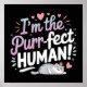 O design apresenta um trocadilho encantador: "Eu sou o Purr-fect HUMAN!" A palavra "Purr-fect" é uma jogada inteligente na palavra "perfeito". O texto é colocado em caracteres negros, chamadores de olhos, com textura brilhante e brilhante num gradiente pastel cor-de-rosa e azul. Um pequeno gato de desenho animado, listrado com cinza, vestindo uma pequena coroa está posicionado no fundo, parecendo feliz e contente. O gráfico também é adorado com pequenos corações e bigodes, que acrescentam seu tom brincalhão e afetuoso. O fundo preto faz as cores suaves e brilham se destacarem. Este seria um design ideal para um posto de camiseta, caneca ou mídia social.