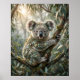 Um encantador coala de eucalipto repousa pacificamente entre galhos enevoados no alto de um dossel florestal. Características realistas de coala se misturam com folhas de eucalipto prateadas, texturas de casca, pelo macio e delicados acentos botânicos. A luz do nascer do sol filtrada e a névoa flutuante criam uma atmosfera fresca e calmante, cheia de calor e serenidade. Este design premium adorável traz conforto e beleza natural para berçários, quartos, espaços de bem-estar ou coleções de presentes. Perfeito para amantes de coalas, fãs da vida selvagem australiana e temas de decoração de natureza calmante.