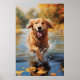 Retriever de ouro que atravessa uma corrente no outono