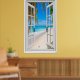 Olhar para o oceano é uma janela falsa. Cena de palmeiras e praias, para uma parede de escritórios sem janelas. Poster de cenas de ilusão óptica divertida e realista para um escritório ou uma parede de estudo.