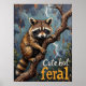 Este trabalho de arte captivador captura um guaxinim com suas marcas características, escalando habilmente um tronco de árvore mascarada. O fundo é uma mistura suavemente focada de blues escuros e amarelos acinzentados, possivelmente indicando sol ou amanhecer na floresta. A frase "CUTE MAS FERAL" é destacada em letras brancas estilizadas na parte inferior da imagem, apontando para a natureza selvagem do animal.