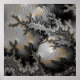 Um objeto esférico com uma superfície refletora se senta de forma destacada entre padrões complexos e fractais com vários tons de cinza, preto e ouro. Os intrincados padrões aparecem quase como uma paisagem texturizada, enquanto a esfera age como uma lente distorcendo e comprimindo os detalhes ao redor.