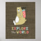 Arte na parede branca apresenta o estilo escandinavo Boho ursinho completo com silêncio, com o texto multicolor "Explore the World" sobre a rusticária burlap look background
