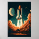 Isso representa um poderoso foguete espacial à medida que ele sai do painel de lançamento e se dirige para a infinita extensão do espaço externo. O foguete é rodeado por nuvens de fumaça e chamas, somando ao drama e ao entusiasmo da cena. O poster certamente encantará qualquer um com interesse na viagem e exploração do espaço.