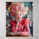 Um retrato espantoso de uma idosa elegante, com um estilo de cabelo rosado extravagante e um traje de convivência, exuberando confiança e charme. Sua composição vibrante e seus acessórios detalhados, incluindo broches em forma de coração, evocam temas de amor e paixão. Com um sutil festeiro de seus lábios, ela parece soprar um beijo delicado, adicionando um toque de romance ao confortável fundo do café.