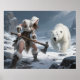 A fierce female warrior stands ready with her axe in a snowy landscape, face-to-face with an imposing polar bear. The scene conveys a sense of tension and bravery in the harsh, icy terrain.
