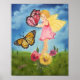 Uma bela fada parada numa cama de papoilas brincando com 2 borboletas grandes