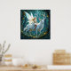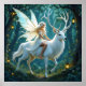 Fairytale poster. A beautiful fairy in white riding on a white magical deer. Pretty fairy tale enchanted forest.