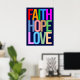 Fé, Esperança, amor estilizado, texto elegante. Cada letra de uma cor individual. Impressão de arte de poster artística positiva, cristã e artística para qualquer um. Você pode transferir este design para outro produto, basta usar a opção a seguir. Divirta-se, comprar, aproveite, fique seguro e seja feliz!