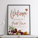 Chá de panela de sinal de boas-vindas ao outono moderno glamouroso, poster, de outono moderno, com flores arruinadas de laranja e burgundy, folhagem verde, coração e um estilo clássico, manuscrito e branco, estilo escovado de cobre, brilho caligráfico sobre fundo branco. ++++++++++ Fácil de personalizar com o nome da noiva, data e local! ++++++++ Adequado para o glame floral moderno, final do jardim ao ar livre no verão ou outono em festas elegantes de noivas de casamentos.