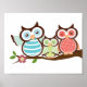 Família de coruja fofa. Corujinha sentado em um galho de árvore com sua mamãe coruja e papai coruja