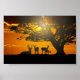 Um pequeno rebanho de veados se acomoda durante a noite sob um enorme carvalho com um sol brilhante atrás deles.