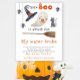 Apresentando uma aquarela fofinha de fantasma bebê e estética de Halloween. Um pouco de bu está quase a chegar! Chá de fraldas temático do Halloween com fantasma de aquarela, gato preto, chapéu de bruxa, esfregão mágico, aranha pendurada numa teia. O pequeno fantasma está comendo um pirulito.