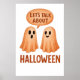 Dois fantasmas de desenho animado com diferentes expressões se engajam em uma conversa. Acima deles, uma bolha de fala diz "Vamos Fala Sobre Halloween".
