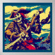 Esta é uma ilustração de um esqueleto pirata segurando uma espada. O pirata está vestindo um chapéu grande e um casaco longo com um caimento de ouro e uma faixa vermelha. O fundo é um oceano azul com ondas e um céu azul com nuvens. O estilo gráfico ousado e as cores brilhantes dão à imagem um ar de perigo e entusiasmo que certamente atrairá a atenção de quem a vir. Esta design é perfeita para qualquer fã de fantasia e arte fantástica.