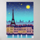 Uma fantasia estilizada do horizonte de Paris, sob um céu azul estrelado, com uma lua de cheio