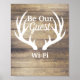 Poster russo estilo fazendeiro "Seja Nosso Convidado" com fundo de madeira e galhadas de veados brancos. Enquadre e escreva a sua senha WiFi no vidro com um marcador de apagamento seco!