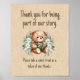 Adicione um toque atencioso à sua mesa favorável ao chá de fraldas com este Sinal de Favoritos do Storybook de 8"x10". Apresentando uma doce mensagem de gratidão, um ursinho lendo um livro, e flores de aquarela e verde macios, esse cartaz gravatas perfeitamente em uma floresta ou uma celebração temática de um livro de histórias. A frase sincera, "Obrigado por fazerem parte da nossa história", faz com que os vossos convidados se sintam apreciados enquanto adicionam charme e coesão à vossa decoração de eventos. Ideal para exibição com pequenos presentes, doces ou bolsas de goela.
